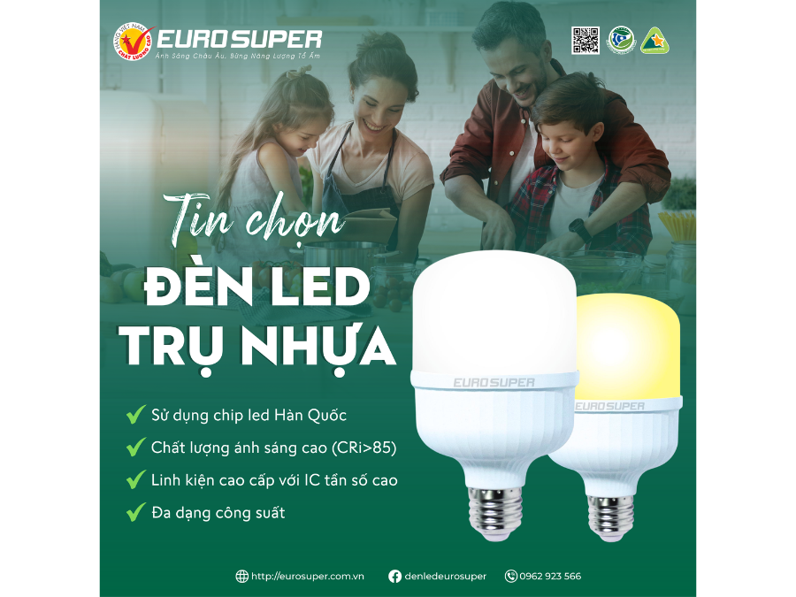 Hiện nay, EUROSUPER cung cấp cho thị trường các dòng đèn LED trụ nhựa ánh sáng trắng và ánh sáng vàng với các công suất từ 5W - 65W.